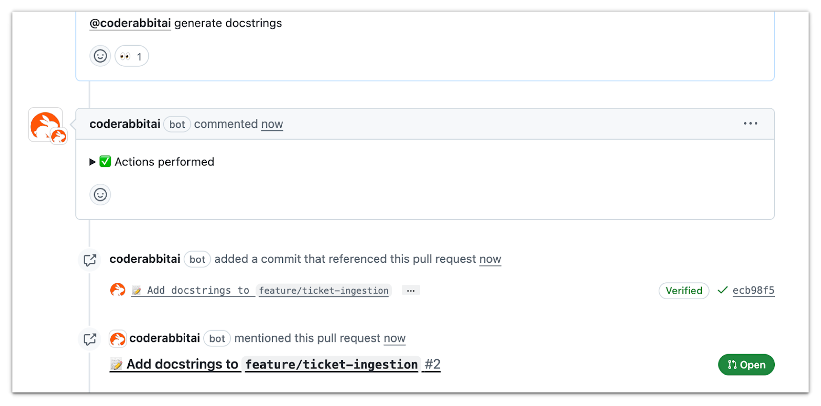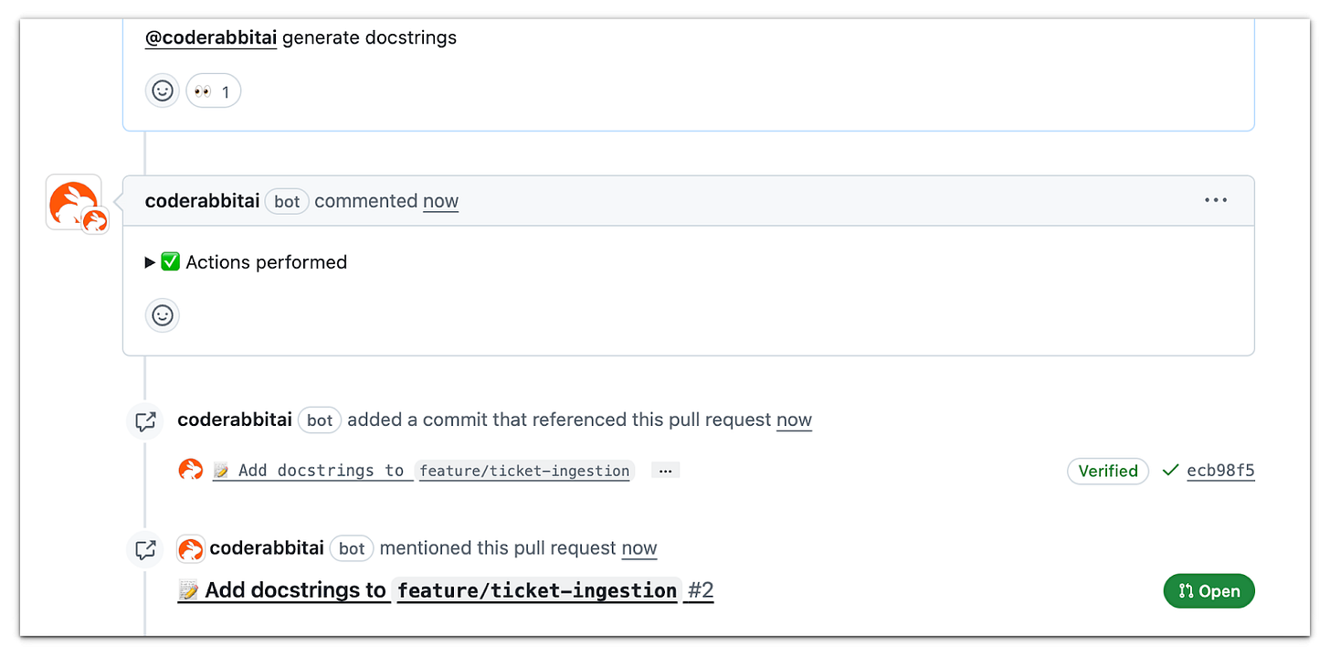 Once a pull request’s code changes are ready and initial reviews are done, a developer or reviewer can simply comment @coderabbitaigenerate docstrings on the pull request.