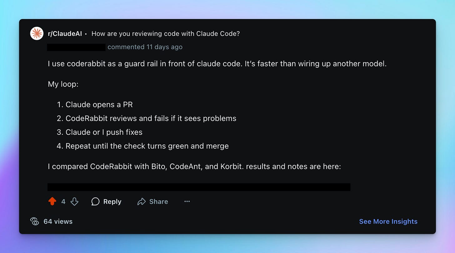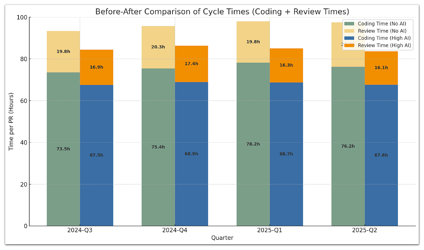 Early adopters report that AI code reviewers have supercharged their development workflow. One big win is speed: Teams merge pull requests much faster when an AI handles the initial review pass. Internal benchmarks from CodeRabbit claim that using AI cuts manual review time by 50% on average.