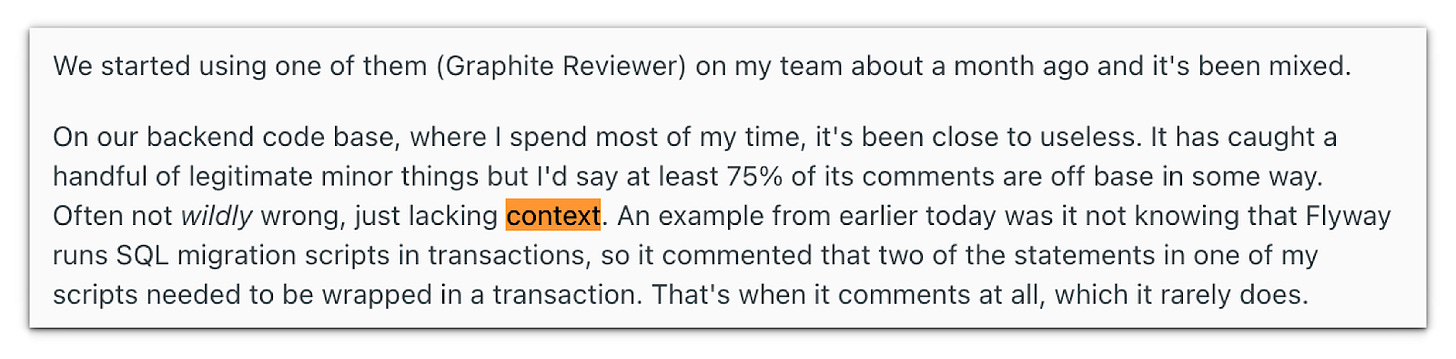 Context blindness is another challenge. An AI works with the information it’s given – typically the code diff, some surrounding code, maybe the project docs. It doesn’t inherently know the unwritten context: the business rationale, the ticket conversation, the future roadmap.