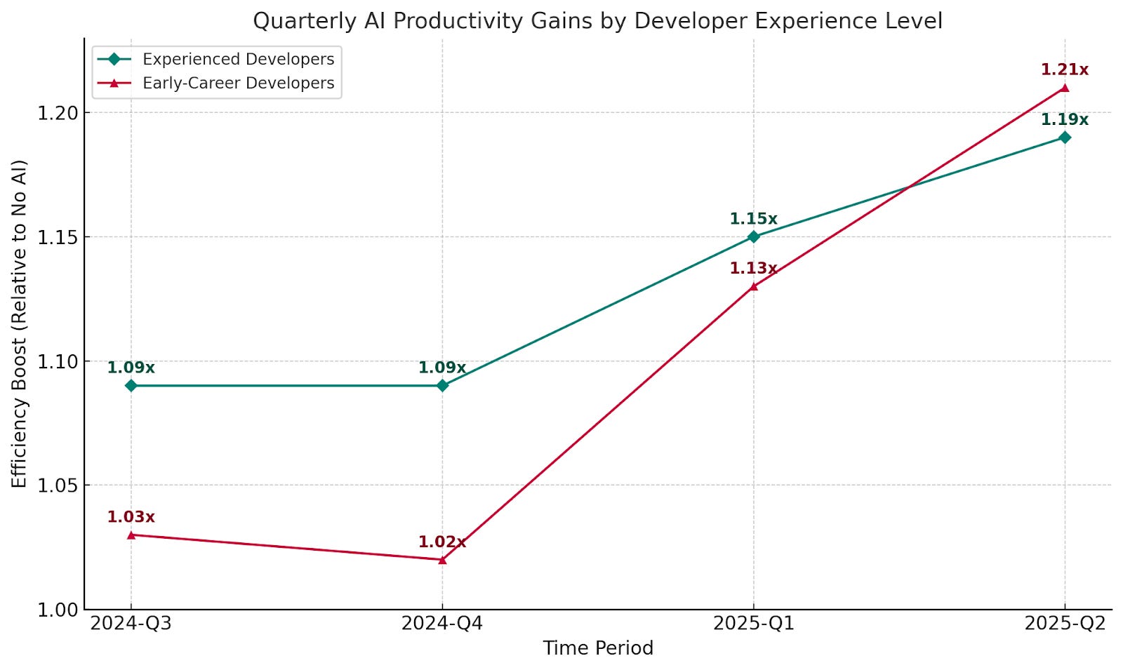 While senior engineers initially saw the greatest productivity gains from AI, junior engineers have rapidly closed the gap.