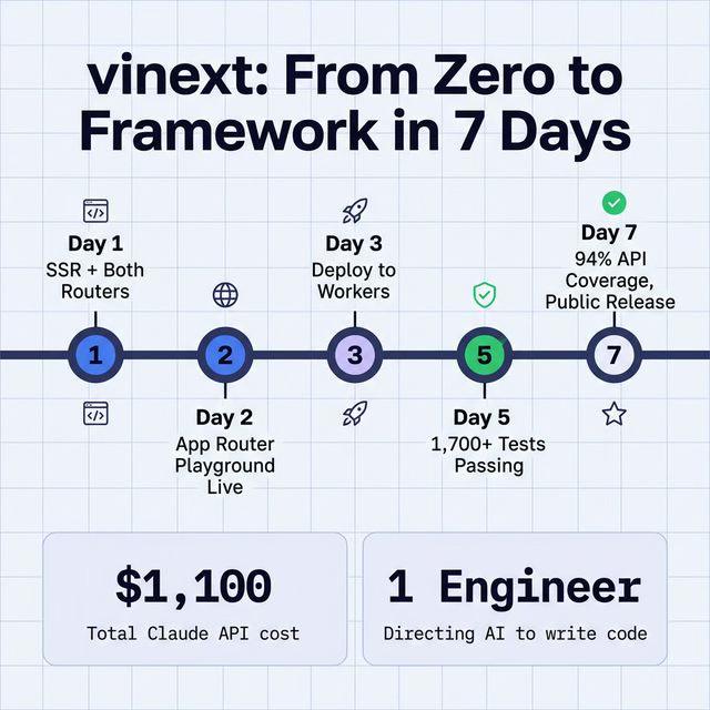 Within a week of vinext release, it had both routers working with Server-Side Rendering (SSR), middleware, server actions, streaming, and full client hydration, all for about $1,100 in API tokens.
