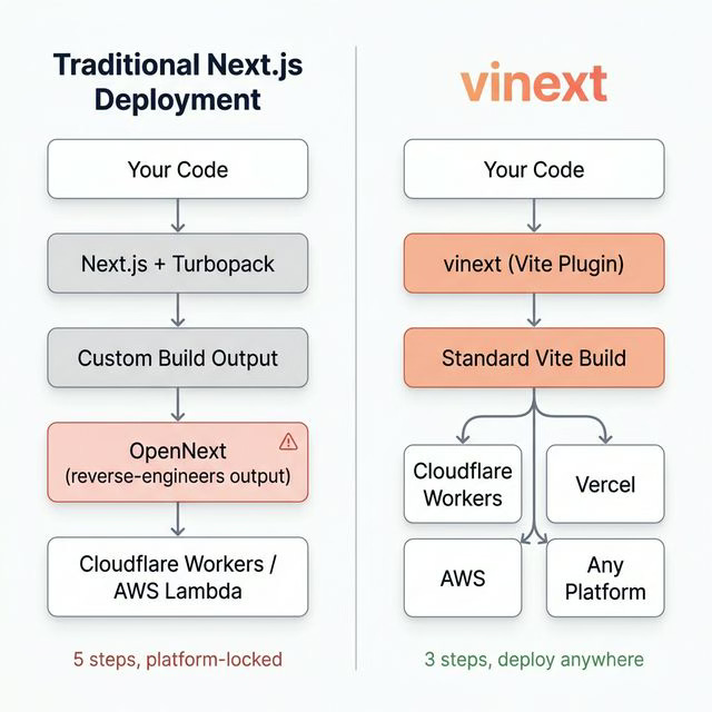 From an ecosystem perspective, vinext is mostly just Vite. About 95% of its codebase is pure Vite, meaning none of the routing, module shims, SSR pipeline, or RSC integration is Cloudflare-specific.