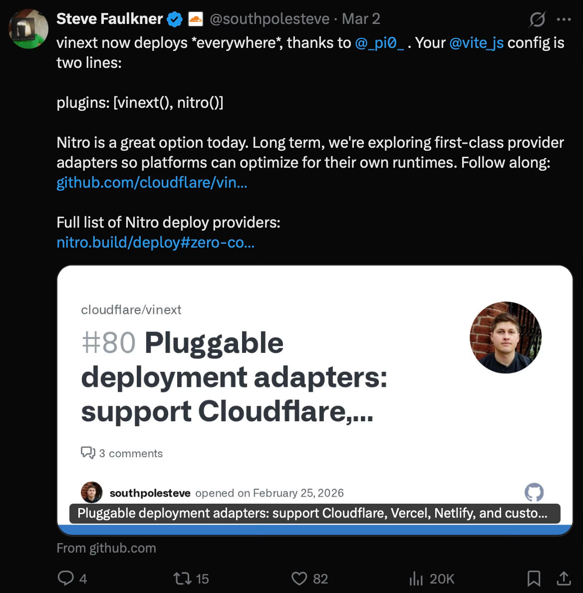 That kind of rapid iteration, going from Cloudflare-only to deploying everywhere via Nitro within days of release tells how far the project got in a very short time.