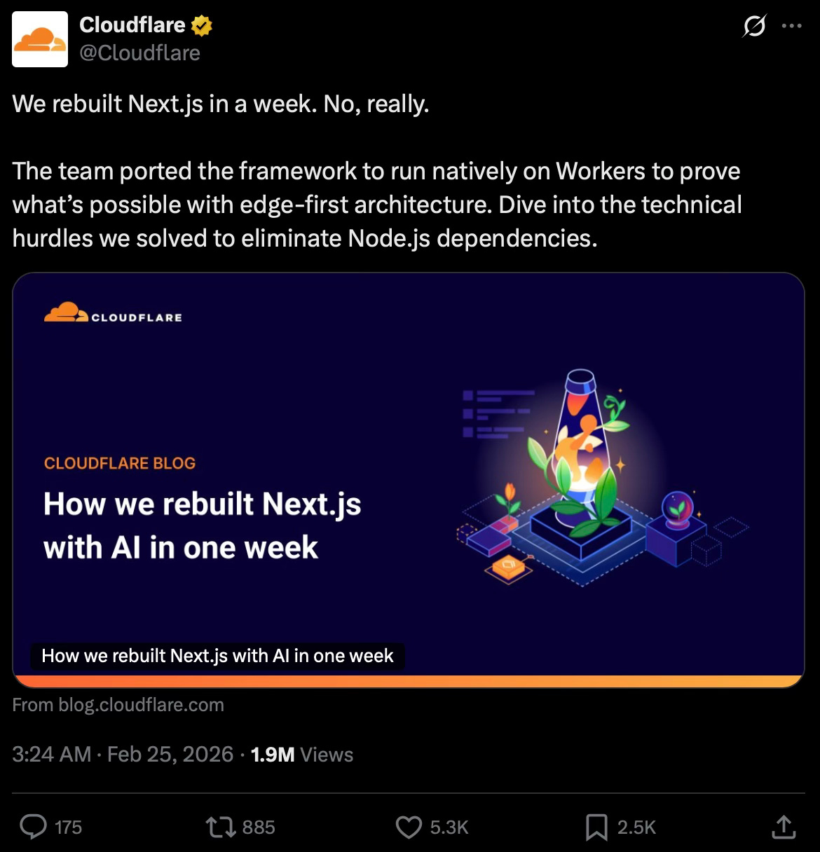 Cloudflare took one engineer, pointed an AI model at the problem and rebuilt Next.js from scratch on Vite in under a week.