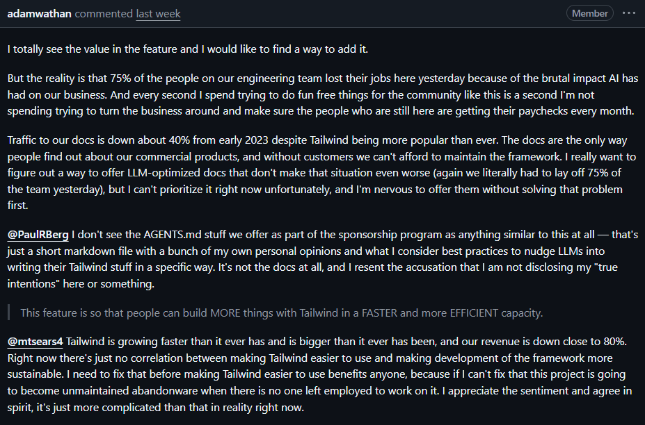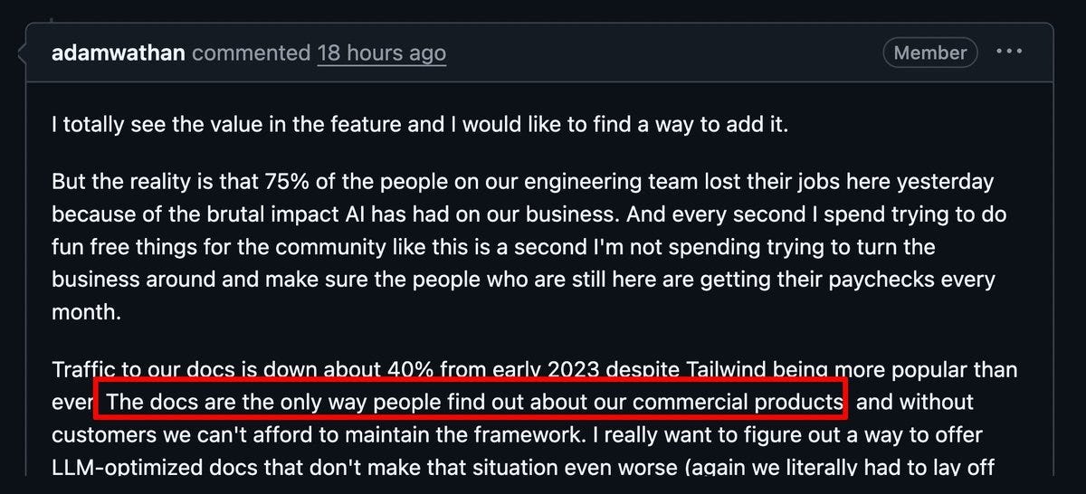 I commend Adam for coming out to share the challenges that Tailwind has been facing. That level of transparency is a lesson for all of us. In many ways, it is this honesty that is currently keeping Tailwind from dying out.